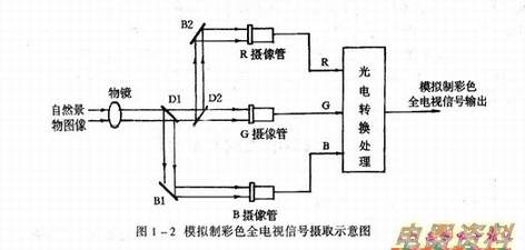 在传统的模拟制彩色电视传送的基本方案中,是根据三基色原理,在发送端把自然景物的彩色利用分色系统分解成红、绿、蓝三种基色,进而用三支摄像管把三基色的光图像变换成相应的三个电信号,通过有线或无线的形式传送到接收端。摄像机所摄取自然景物的图像首先通过物镜,送到后面的分光镜上,如图1-2所示。分光镜有D1、D2二只,D1只反射蓝色光,并让其余色光透过,所以彩色中的蓝色光分量被分离出来,通过反射镜B1投到下面的蓝色光摄像管上。其余的色光透光分光镜D1到达分光镜D2。D2只反射红色光而让其余的绿色光透过。分离出的红色光通过反射镜B2投到上面的红色光摄像管上。最后剩下的绿色光通过D2投到后面的绿色光摄像管上。分解后的三幅基色光图像被转换为相应的三个电信号,再经处理变换之后传送出去,从而产生了模拟制彩色电视信号。