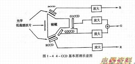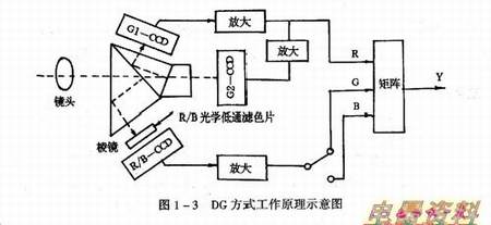 什么是CCD器件呢?CCD是英Charge Coup Deve的缩写词,意为氧化物介质,具有电荷转移及延时特性。自1993年以来,日本NHK技术研究所利用3只CCD摄像器件形成的空间偏置技术,大大提高了HDTV摄像机的图像质量,从而新一代双重绿色拾取方式的高清晰度摄像机问世了。这种双重绿色拾方式被简称为DG拾取方式。其工作原理如图1-3所示。人们经过长期研究发现,要实现高清晰度电视,必须在彩色显像管的色品图进步的基础上,使亮度议程: