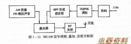 当脉冲数字编码完成后,主要是对其进行调制。调制方法主要采用差分正交相移键控(DQPSK)数字调制方式。调制后的数字声信号和调频的模拟声音信号及调幅的图像信号进行相加,由RF发射机通过天线发射出去。其工作方框图如图1-11所示。