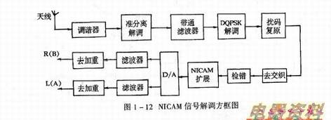 当NICAM的RF信号被接收机接收后,必须要由解码器将其数据码流还原来模拟音频信号,才可听到美丽的声音。为此,数字声信号,首先要经器进入准分离声音解调电路,得到中心频率为5.65MHz(PAL-D制NICAM)的数字载波信号,然后再送到数字处理通道。如图1-12所示。