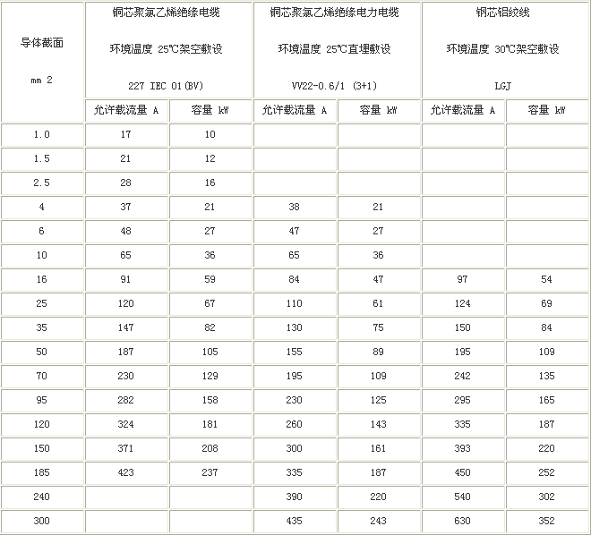 4.本表聚氯乙烯绝缘电线按单根架空敷设方式计算,若为穿管或多根敷设,则应选用大2~3个规格