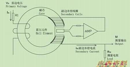 被测Vn流过R1的通过导体产生的磁场,由元件输出信号控制的补偿电流Im流过次级线圈产生的磁场补偿,当原边与副边的磁场达到平衡时,其补偿电流Im即可精确反映原边电压值。