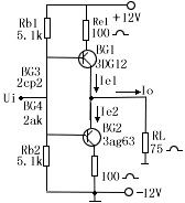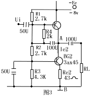 | 图3是串接式的跟随器,其特点是:(1)类似图2一样,R4两端交流电压具有自举作用;(2)BG2采用共基接法,使2具有恒流作用,A、B两点交流阻抗RAB大大也提高,从而提高了跟随器的输入阻抗。 |