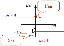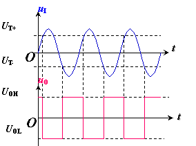 - 当uI<0时,运算放大器输出为正的最大值,即高电平电压UOH=+U0max