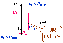 由于从同相端输入且只有一个门限,通常把比较器输出电平发生跳变时的输入电压称为门限电压UT?,可见该电路的门限电压为UT= UREF