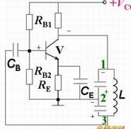 图中三极管V构成共发射极放大电路,电容C1、C2和电感L构成正反馈选频网络。谐振回路的三个端点①、②、③,分别与三极管的三个电极相接,反馈信号取自电容C2两端电压,故称为电容三点式振荡电路,也称为电容反馈式振荡电路。