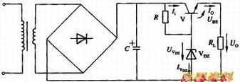 用三极管V代替图8.2中的限流R,就得到图8.3所示的串联型三极管稳压电路。