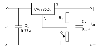 为了使电路正常工作,一般输出电流不小于5mA。输入电压范围在2~40V之间,输出电压可在1.25~37V之间调整。负载电流可达1.5A,由于调整端的输出电流非常小(50μA)且恒定,故可将其忽略,那么输出电压可用下式表示: