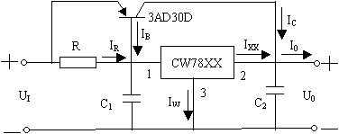 当负载电流大于三端稳压器输出电流时,可采用图8.10(b)所示电路。
