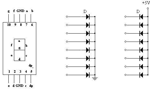 比较例5.4和例7.1可知,同样是显示数字信息,例5.4是通过P1口每一位状态的显示来获取信息,例7.1是直接通过数码管显示的数字来获取信息,显然,后者更加直观、快捷,从获取信息的角度来看,例7.1优于例5.4。由例7.1可具体剖析数码管的结构,分析其工作原理。