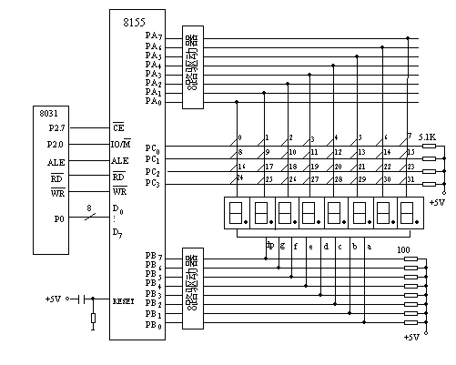 如采用图7.20的电路实现实训7中的功能,软件设计将有所改观。采用8279与8051接口,在CPU对8279进行初始化后,只需向8279传输待显示数据(送数),再就是在8279键盘中断申请发出后,取键盘数据识别按键(取数),即可实现按键识别和动态显示。至于要花费CPU大量时间的键盘扫描程序和动态显示程序,全由8279硬件自动完成,CPU再也不必象实训7那样不断调用动态显示子程序,不断查询是否有按键按下,大大提高了CPU的工作效率。读者可自行编程实现实训7中的所有功能。