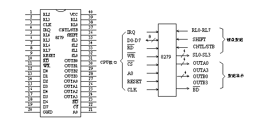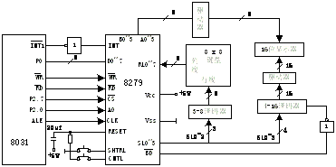 8279是一种功能较强的键盘/显示接口电路,可直接与Intel公司的各个系列的单片机接口,可以外接多种规格的键盘和显示器。图7.19是8051与8279的一般接口框图,图中8279外接8×8键盘,16位显示器,由SL0~SL2译出键扫描线,由4~16译码器对SL0~SL3译