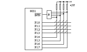 左图是一种简易键盘接口电路,该键盘是由8051P1口的高、低字节构成的4×4键盘。键盘的列线与P1口的高4位相连,键盘的行线与P1口的低4位相连,因此,P1.4~P1.7是键输出线,P1.0~P1.3是扫描输入线。图中的4输入与门用于产生按键中断,其输入端与各列线相连,再通过上拉电阻接至+5V,输出端接至8051的外部中断输入端