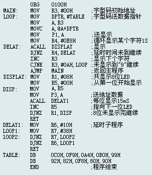 | 此电路中,74LS273用于驱动LED的8位段码,8位LED相应的"a"—"g"段连在一起,它们的公共端分别连至由74LS138(点击芯片型号可浏览其详细的技术手册)译码选通后经74LS04驱动的输出端。这样当选通某一位LED时,相应的地址线(74LS04输出端)输出的是高,所以我们的LED选用共阳LED。 动态扫描的频率有一定的要求,频率太低,LED将出现闪烁现象。如频率太高,由于每个LED点亮的时间太短,LED的亮度太低,肉眼无法看清,所以一般均取几个ms左右为宜,这就要求在编写程序时,选通某一位LED使其点亮并保持一定的时间,程序上常采用的是调用延时子程序。在C51指令中,延时子程序是相当简单的,并且延时时间也很容易更改,可参见程序清单中的DELAY延时子程序。 为简单起见,我们只是编写了8位LED同步显示"00000000"—"11111111"直到"99999999"数字,并且反复循环。程序很简单,流程图略去。 · 程序清单: |