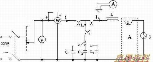 经指导老师检查后,接通市电,将自耦调压器的输出调至220V,记录功率表,电压表读数,通过一只电流表和三个电门插座分别测得三条支路的电流,改变电容值,进行三次重复测量填入4-3中。