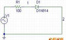 用鼠标单击Draw=> Get New Part, 取出电阻R,系统自动命名为R1;正弦电压源VSIN,系统自动命名为V1;取出二极管D1N914,系统自动命名为D1;取出地线EGND,系统自动设置为0点。