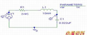 在[Schematics]主菜单下,用鼠标单击分析[Analysis]中的设置(Setup),选中Transient设置(在选项前的小框内打勾),将其时间间隔(Print Step)设为20ns及长度(Final Time)为1ms。Step Ceiling是软件内部计算时间间隔,不用管它。在Parametric中,扫描变量仍为全局变量var,可以选择线性扫描,线性扫描的起点设为1P,终点为5K,步长为500;或者取值扫描,取不同的值,以观察无阻尼、欠阻尼、过阻尼和临界阻尼状态下的各种波形。