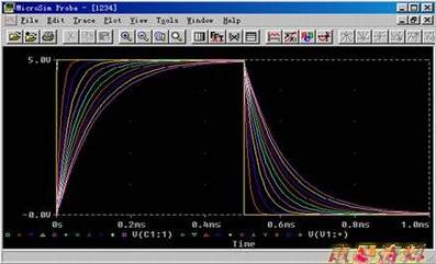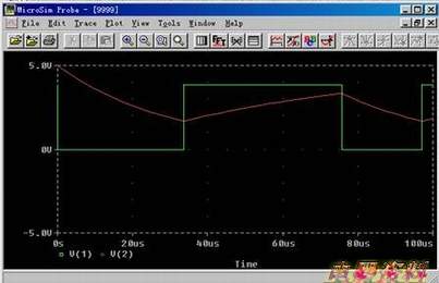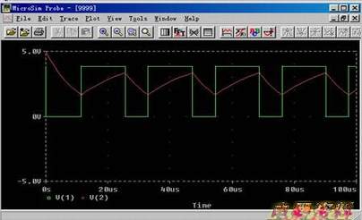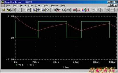 在实例的原理图中将输出端设置为节点1,图17-8便是输出端的电压波形与电容上的电压波形的叠加。从图中我们可以清楚的看到方波和放电波形以