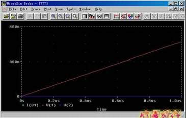 4. 在菜单中单击[Analysis]选项,首先选“Electronic Rule Cheak”,它会提示你应先存盘,存完盘后就“Creat Netlist”,接下来就是“Setup”选项中选择要仿真的类型,如:暂态、稳态等,选择其中的参数:扫描间隔、扫描时间等等。最后可以按下仿真图标,就可以在形成一个示波器的图形界面,选择所要观测的节点可以看其电流电压的波形,而且还可以利用函数来求节点间或元件间的电压、电流波形。