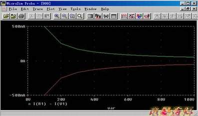 3. 启动分析后,进入Probe窗口。选择Trace=>Add...在同一坐标轴上分别加I(Rl)和 I(Vl)变量。如图17-12所示。由此图的分析结果我们便可与欧姆定律相验证。