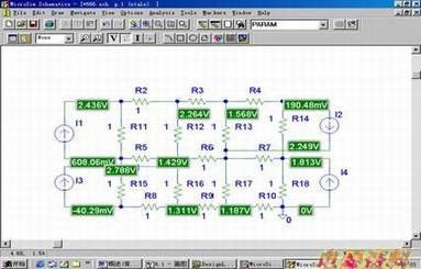 步骤:1. 调用[Schematics],绘制好电路原理图17-13。设置好元器件参数,其中所有的电阻值都为1Ω;通用电流信号源(I)的直流电流值(DC)分别为:I1为2A,I2为3A,I3为2A,I4为3A。起名存盘。