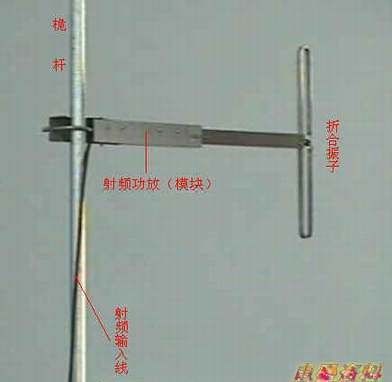 当需要发射的范围更大时,可在调制器之后再加一级放大,最简单最便宜的方法是使用有线电视系统的功率倍增模块,最大输出功率可达7-8W。为了使用方便,我们将放大模块和垂直放置的折合振子整合为一体制成发射单元,如下图所示。