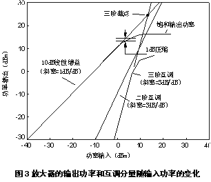 放大器有一个线性,在这个范围内,放大器的输出功率随输入功率线性增加。这种放大器称之为线性放大器,这两个功率之比就是功率增益G。随着输入功率的继续增大,放大器进入非线性区,其输出功率不再随输入功率的增加而线性增加,也就是说,其输出功率低于小信号增益所预计的值。通常把增益下降到比线性增益低1dB时的输出功率值定义为输出功率的1dB压缩点,用P1dB表示。(见图3)