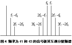 测量放大器的非线性特性,最简单的方法是测量1dB压缩点功率P1dB。另一个颇为流行的方法是利用两个相距5到10M的邻近信号,当频率为f1和f2的这两个信号加到一个放大器时,该放大器的输出不仅包含了这两个信号,而且也包含了频率为mf1+nf2的互调分量(IM),这里,称m+n为互调分量的阶数。在中等饱和电平时,通常起支配作用的是最接近基音频率的三阶分量(见图4)。![]()