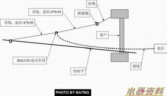 偶极天线有两个臂,一臂从窗口顶部拉到钓鱼竿的末端,另一臂丛钓鱼竿的末端自然下垂。两臂引到BALUN后,通过馈线接到收发机上,BALUN也可不用。