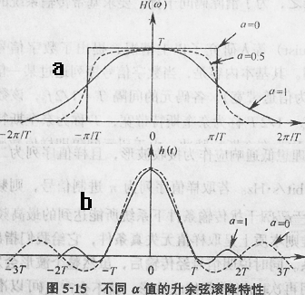 另外已调信号传输时,符号率(SR)和传输带宽(BW)的关系是:BW=SR(1+α),α是低通的滚降系数,当它的取值为0时,频带利用率最高,占用的带宽最小,但由于波形拖尾振荡起伏大(如图5-15b),容易造成码间干扰;当它的取值为1时,带外特性呈平坦特性,占用的带宽最大是为0时的两倍;由此可见,提高频带利用率与\"拖尾\"收敛相互矛盾,为此它的取值一般不小于0.15。例如,在系统,当α=0.16时,一个模拟频道的带宽为8M,那么其符号率=8/(1+0.16)=6.896Ms/s。如果采用64QAM调制方式,那么其比特率=6.896*log2 64=6.896*6=41.376Mbps 。