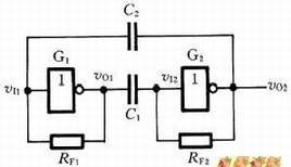 1)可恰当地选取RF1和RF1的值,使反相器的静态工作点P位于电压传输特性的线性区或转折区,波动和外界干扰使VI1有微小的正跳变,必有如下反馈: