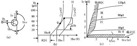 | 1、输入特性 图2 (b)是三极管的输入特性曲线,它表示Ib随Ube的变化关系,其特点是:1)当Uce在0-2伏范围内,曲线位置和形状与Uce 有关,但当Uce高于2伏后,曲线Uce基本无关通常输入特性由两条曲线(Ⅰ和Ⅱ)表示即可。 2)当Ube<UbeR时,Ib≈O称(0~UbeR)的区段为“死区”当Ube>UbeR时,Ib随Ube增加而增加,放大时,三极管工作在较直线的区段。 3)三极管输入,定义为: rbe=(△Ube/△Ib)Q点,其估算公式为: rbe=rb+(β+1)(26毫伏/Ie毫伏) rb为三极管的基区,对低频小功率管,rb约为300欧。 2、输出特性 输出特性表示Ic随Uce的变化关系(以Ib为参数)从图2(C)所示的输出特性可见,它分为三个区域:截止区、放大区和饱和区。 截止区 当Ube<0时,则Ib≈0,发射区没有电子注入基区,但由于分子的热运动,集电集仍有小量电流通过,即Ic=Iceo称为穿透电流,常温时Iceo约为几微安,锗管约为几十微安至几百微安,它与集电极Icbo的关系是: Icbo=(1+β)Icbo 常温时硅管的Icbo小于1微安,锗管的Icbo约为10微安,对于锗管,温度每升高12℃,Icbo数值增加一倍,而对于硅管温度每升高8℃,Icbo数值增大一倍,虽然硅管的Icbo随温度变化更剧烈,但由于锗管的Icbo值本身比硅管大,所以锗管仍然受温度影响较严重的管,放大区,当晶体三极管发射结处于正偏而集电结于反偏工作时,Ic随Ib近似作线性变化,放大区是三极管工作在放大状态的区域。 饱和区 当发射结和集电结均处于正偏状态时,Ic基本上不随Ib而变化,失去了放大功能。根据三极管发射结和集电结偏置情况,可能判别其工作状态。 |