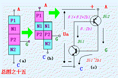 我们可以用图15来说明,把可控硅等效成两个组成的一个互补管进行分析。一个是NPN 型晶体管BG2,另一个是NPN 型晶体管BG1,如图15(b)及(c)所示: