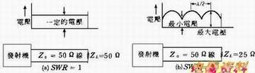 完全匹配,将不产生反射波,这样,在馈线里各点的是恒定的,如下图中左部分(a),不匹配时,在馈线里产生下图右方的电压波形,这驻留在馈线里的电压波形就叫做驻波。