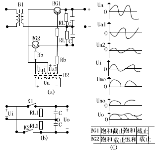 | 下图为半波相敏整流器,以C-e反接(倒置)的晶体三极管BG作解调开关器,工作过程分两种情况:当Ui与Ua为、时,若Ua为左正右负,则BG饱和(倒置工作时,C极和b极的PN结加正向电压,同样可以达到饱和状态),输出等于输入的正半波电压,故输出是正极性电压,但当Ui与Ua时,也就是说,当Ua为左正右负使BG饱和时,Ui刚好是上负下正,故输出是负极性的直流电压。由于整流输出与Ui的相位有关,所以称为相敏整流解调器。它的输出能够反映输入的大小和极性的变化。 |