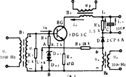 | 下图是DDZ-11型仪表中的实用相敏放大器,在下图A中,输入交流信号为Ui,B3输出交流反馈信号,解调电压Ua由变压器B2输入并经DW1、DW2限幅,使A、B两点之间的方波峰-峰值定在18伏,R2是的限流。当Ua、Ui为反偏置,ib及ic均为零。随着Ui、Ua地变化。iC为一脉动直流,可分解为恒定直流IC及交流iC-,其中IC流过RL变成解调直流电压而交流分量iC-通过变压器B3后得到反馈电压]UF。 当Ui、Ua反相进,io及ic 等于零,说明放大电路对相位有敏感作用 | |