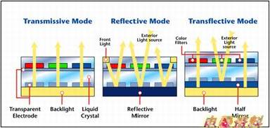 “ 半穿透半反射式”为两者之折中,此装置以反射镜(half mirror)来取代反射板除了可以透过背光以外也可以利用外部光源的反射,以达到省电、提高亮度与减轻重量的效果。