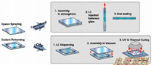 机台投资额下降: 运用ODF制程,我们不再需要真空回火制程、液晶注入机、封口机及封口後的面板清洗设备。 空间及人力节省: 由于项目一所述之制程缩减,相对的人力及空间均可节省下来。