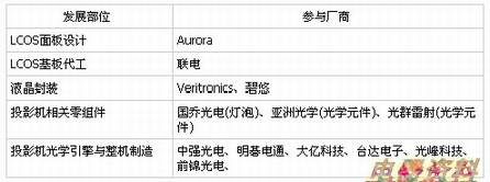 台湾厂商投入LCOS动作相当积极,其中以联电带头邀集的LCOS联盟最具代表性,不过目前暂时受限于技术未成熟,整体开发进度落后,尚未传出具体的量产消息,不过在众多厂商整合上下游研发资源的情况下,LCOS的产品预料将会越来越多,应著眼于长期开发的心态,短期不易有爆发性成长的机会。