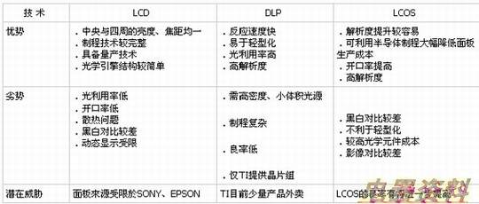 表一 三大投影技术优劣势比较