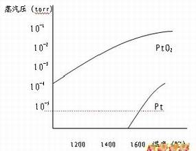 研究证明,Pt在高温下的挥发损失大部分由PtO2造成。PtO2及Pt的蒸汽压曲线见图1。