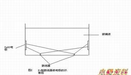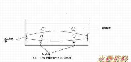 在玻璃的生成阶段为了将原料更好的熔化采取了直接电加热的方式,同时采用鼓泡提高玻璃的熔化程度和均匀性。因此在阶段中玻璃液中有强大的,考虑到高温性能一般采用的鼓泡器是Pt制成,当鼓泡器绝缘不理想时,SnO2电极和鼓泡器间会发生电解反应,从而造成Pt的“熔化”。图1表示的是正常的电极工作,图2则是Pt做电极后的示意。