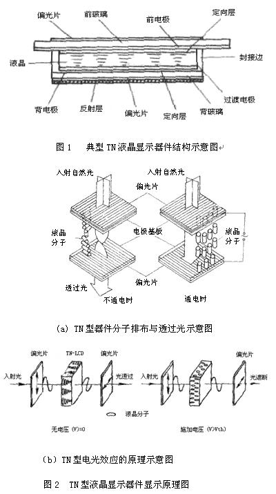 TN型液晶显示器件的基本结构原理是:将涂有ITO透明导电层的玻璃光刻上一定的透明电板图形,将这种带有透明导电电极图形的前后两片玻璃基板夹持上一层具有正介电各向异性的向列相液晶材料,四周进行密封,形成一个厚度仅为数微米的扁平液晶盒。由于在玻璃内表面涂有一层定向层膜,并进行了定向处理,在盒内液晶分子沿玻璃表面平行排列。但由于两片玻璃内表面定向层定向处理的方向互相垂直,液晶分子在两片玻璃之间呈90°扭曲,这就是扭曲向列液晶显示器件名称的由来.图1为TN型液晶显示器件的构造,图2为其原理图。