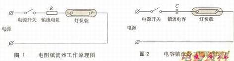 工作原理如图1所示。镇流的工作效率低,要确保电阻镇流正常工作,应使供电不低于2倍的灯工作电压。实用中应用不多。