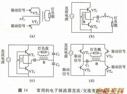 从工作原理而言,电子镇流器是一个电源变换电路,它将交流输入市电电源的波形、频率和幅度等参数进行变换,为灯提供供电电源,并且要求这个灯负载供电电源电路应能满足灯负载对灯丝预热、点火、正常工作和在灯负载电路有故障状态的保护功能要求。常用的电子镇流器直流/交流变换电路(DC/AC)如图14所示。