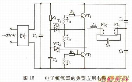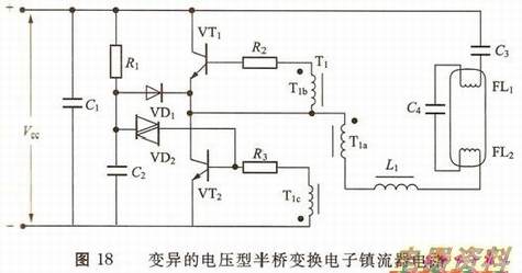 图15所示电路的工作原理如下:功率开关VT1和VT2为半桥功率变换级的两只开关管,电容C3和C4组成无源支路,灯负载接在无源支路的中点和半桥开关组成的有源支路的中点之间,灯负载电流由C3、C4提供,电阻R1、电容C2和VD2组成半桥自激振荡电路的启动电路。