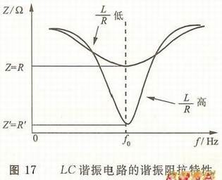 LC谐振电路的谐振阻抗特性如图17所示,由图17可以看出,在谐振频率f0处,L/R值越大,则谐振电路的Q值越高,灯电路的电流也就越大,反之,L/R值越小,则灯电路的电流越小。在荧光灯电子镇流器的设计中,应适当选取L和C的数值,使电路的Q值在3左右。