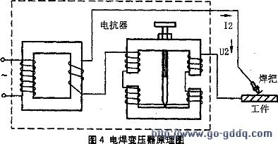 (4)电焊变压器的工作原理,之间就产生电弧。电弧相当于一个,当焊条与焊仟间的距离变化而使电弧长度发生变化时,电弧压降也由于弧焊的需要,电焊变压器的原、副绕组不是同心地套在一起,而是分装在两个铁心柱上,如图4所示。这样可以获得较大的漏抗,而且调节电抗器的空气隙还可以调节漏抗的大小,改变输出电压与工作。