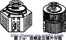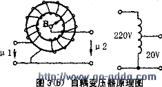 (3)自耦变压器的工作原理(见图3a、b) 自耦变压器是利用自耦合原理制成的变压设备,它只有一个绕组,一次侧和二次侧有一部分是公用的,即高压绕组的一部分兼做低压绕组。和普通变压器一样,自耦变压器的一、二次电压比仍等于一、二次绕组的匝数比。自耦变压器常做成可调式的,它有一个环形的铁心,线圈就绕在这个环形的铁心上。自耦变压器的中间触点制成了活动电刷触点,当调整移动触点位置时就可平滑地调节输出电压。