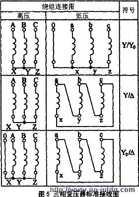 图5为三相变压器的标准接线图。从图中可以看到,高压绕组一般是接成星形,这是因为星形联接的为的根号3 分之1,有利于线圈绝缘。低压绕组通常接成三角形,以减小负载不平衡时的影响。